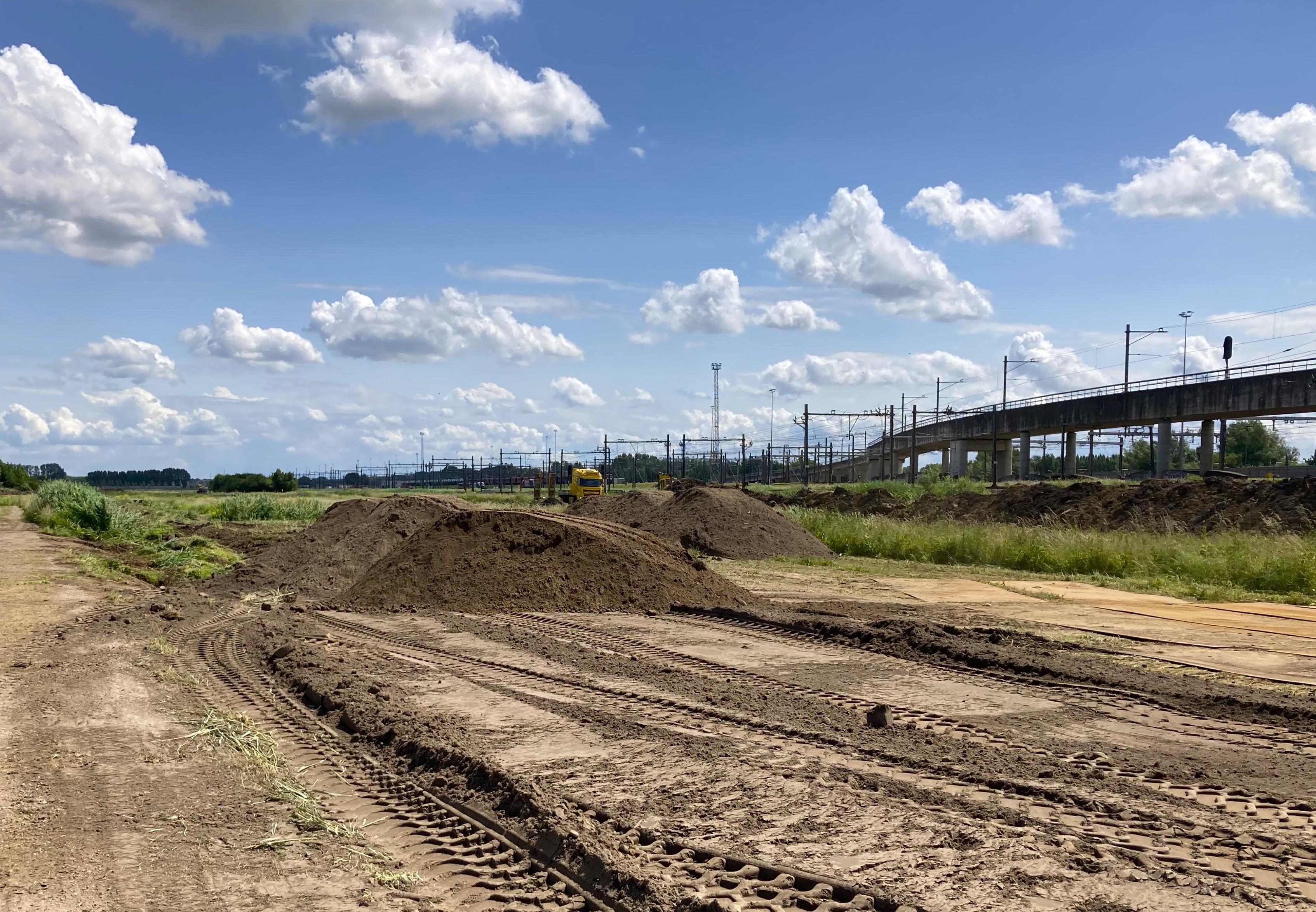 De voorbereidingen in de eerste helft van 2025 zijn afgerond en we zijn een paar weken geleden begonnen met de aanvoer van grond voor de onderlaag. Dat is de eerste meter van de wal. Die laag versterken we met slimme technieken zoals geogrid en verticale drainage. Zo blijft de wal stevig en veilig liggen. De aanleg gebeurt stap voor stap en zal in totaal zo’n zes jaar duren. Tijdens het werk houden we alles goed in de gaten, onder andere om druk op waterleidingen en spoor te voorkomen.