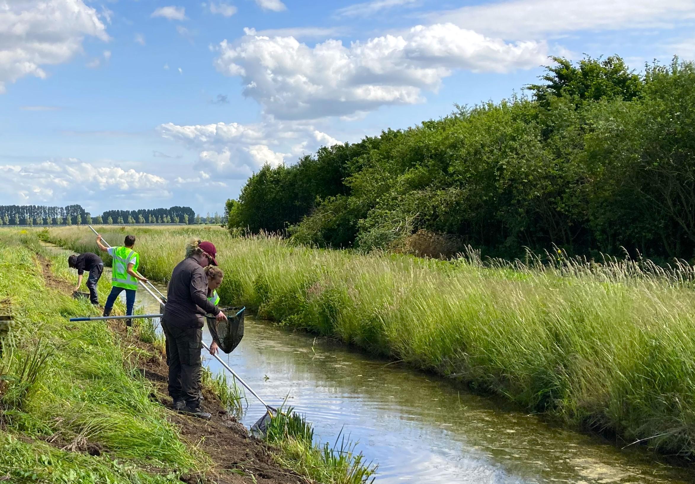 Op de foto: een team van deskundige ecologen heeft de slakjes en de watervegetatie inmiddels verplaatst naar de nieuwe watergangen.