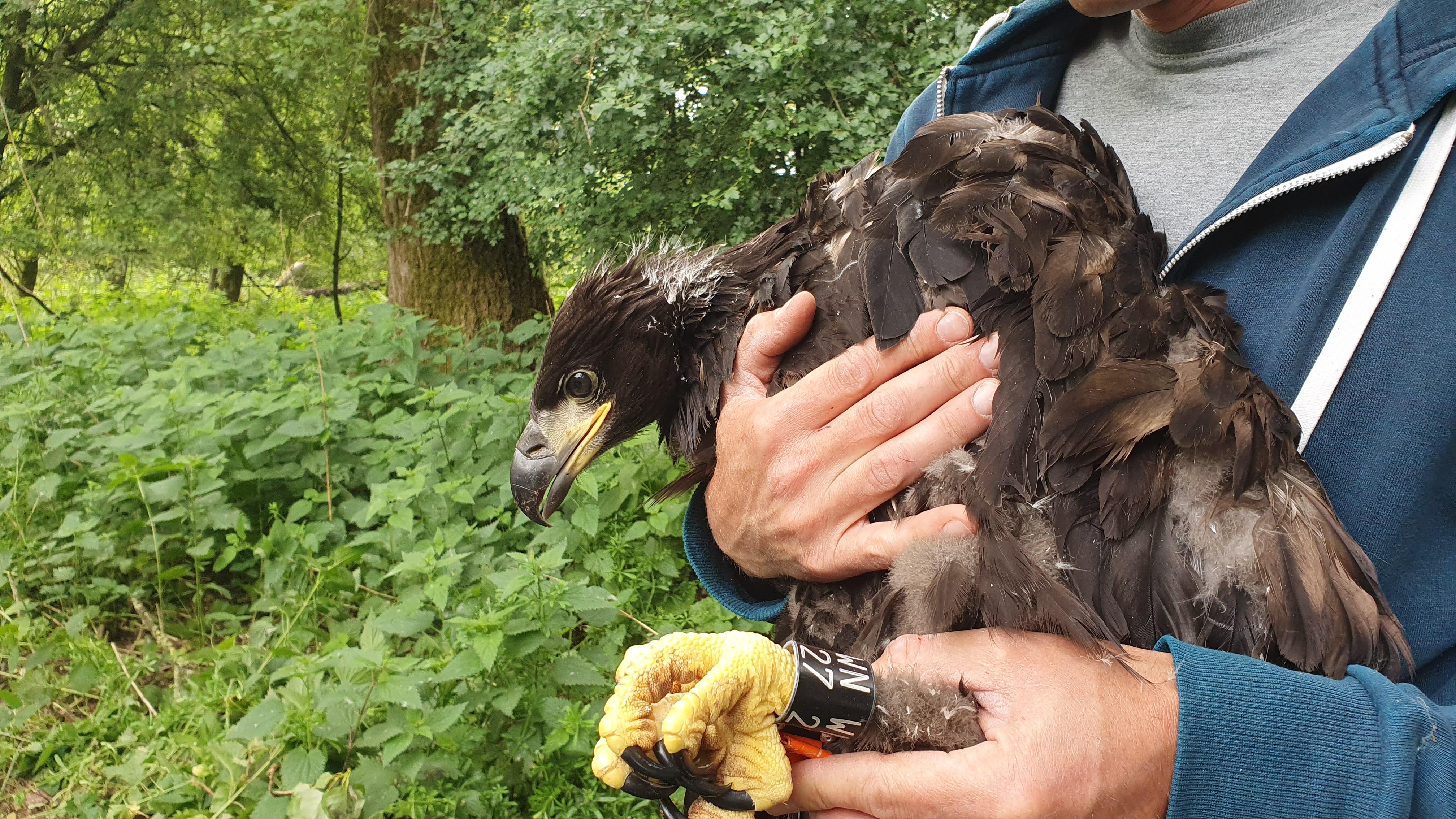 Op de foto: jonge zeearend wordt gecontroleerd en geringd door Werkgroep Zeearend om individuele vogels te kunnen volgen.