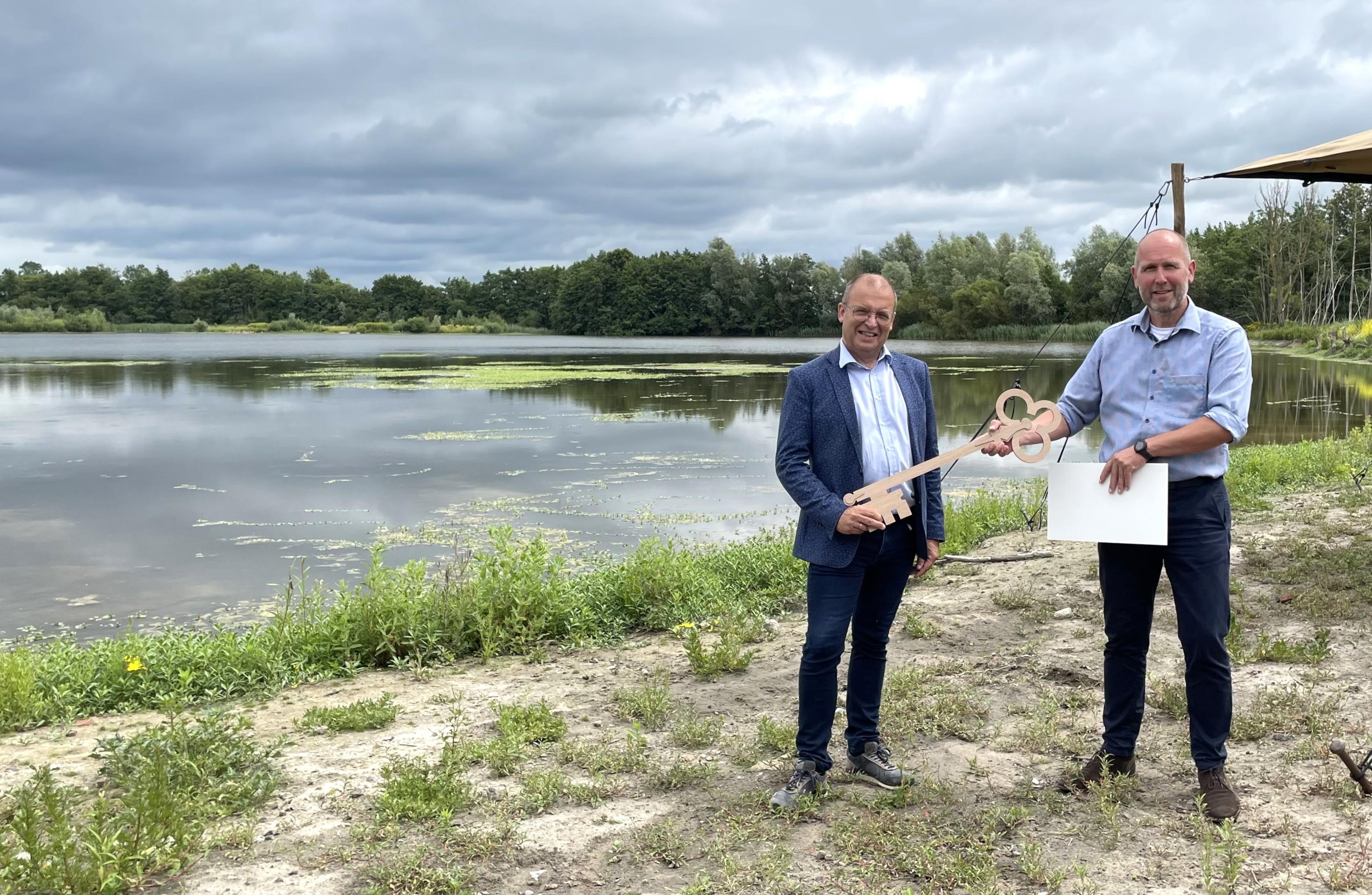 Op de foto: Wethouder Nederveen (links) ontvangt de sleutel uit handen van Hendrik Jan Barten (directeur Grondbank GMG).