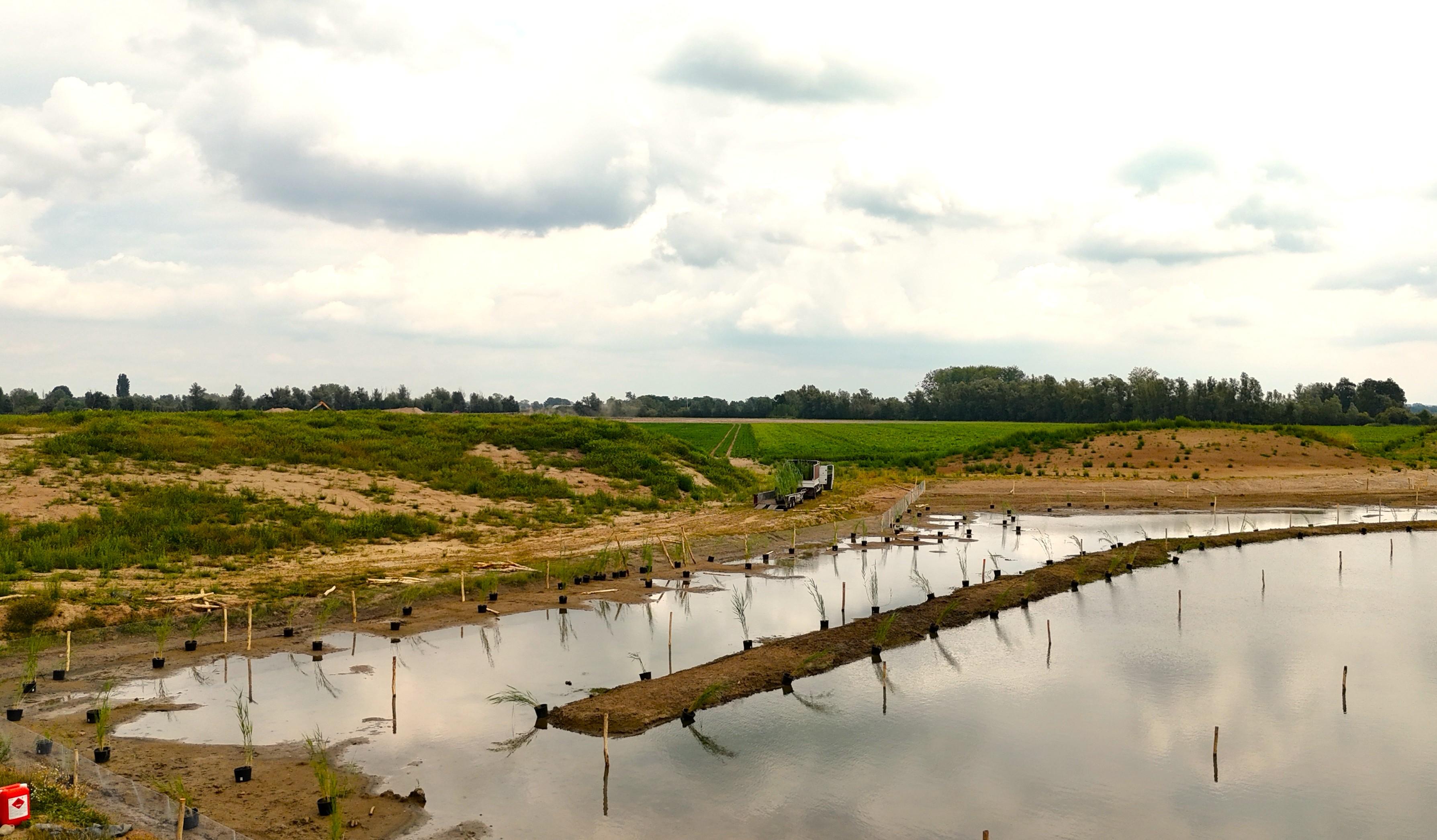 Aan de zuidzijde van het gebied (nabij de Thornsche molen) zijn we in december begonnen met de aanleg van het nieuwe rietmoeras. We hebben ondiep water gegraven met flauwe oevers; de ideale omstandigheden voor riet. In augustus en september is het riet geplant en zijn linten gespannen om dit riet te beschermen tegen ganzen.