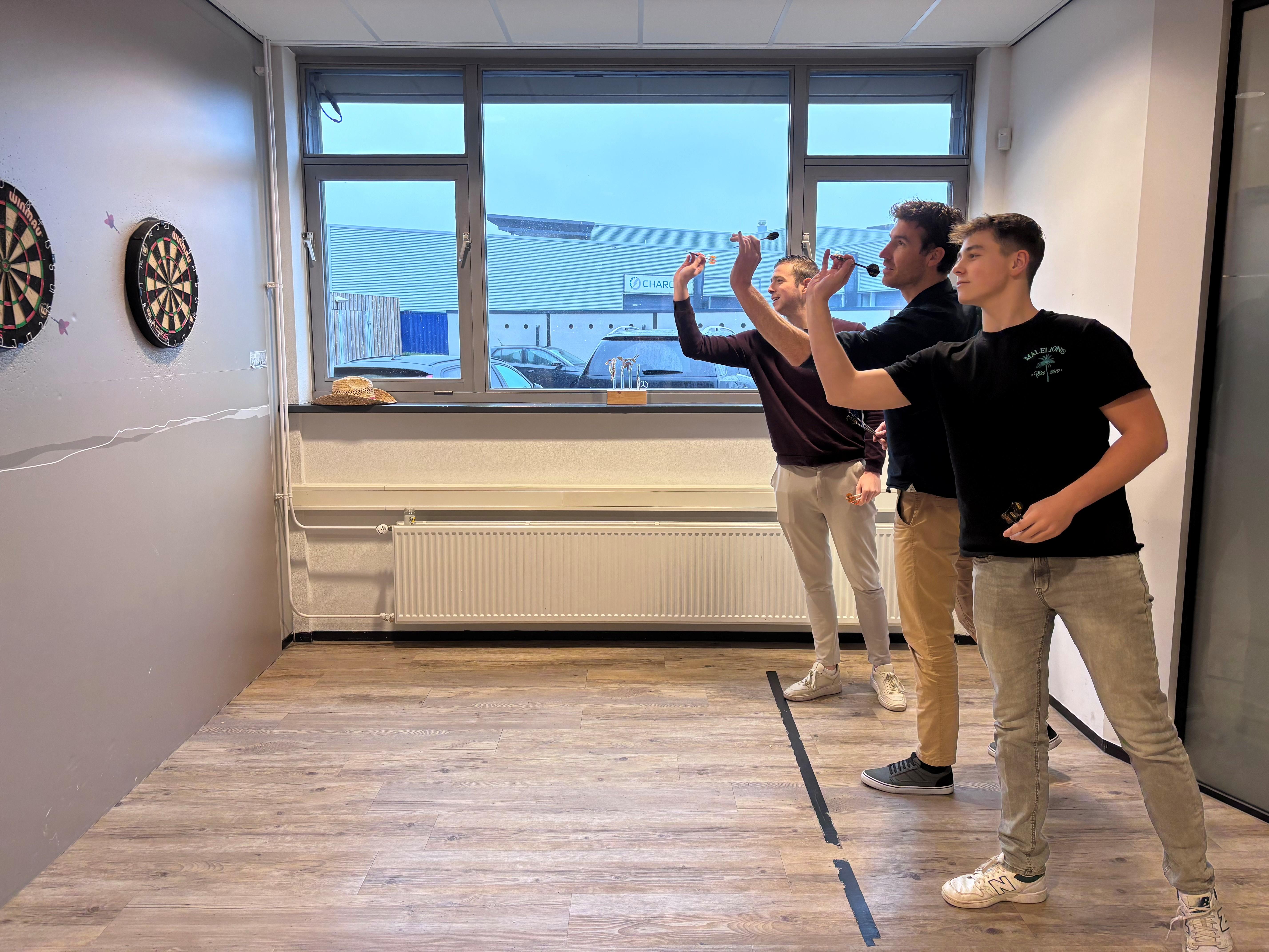 Op de foto: darten met collega's Luuk (stagebegeleider van Dave) en Nick.