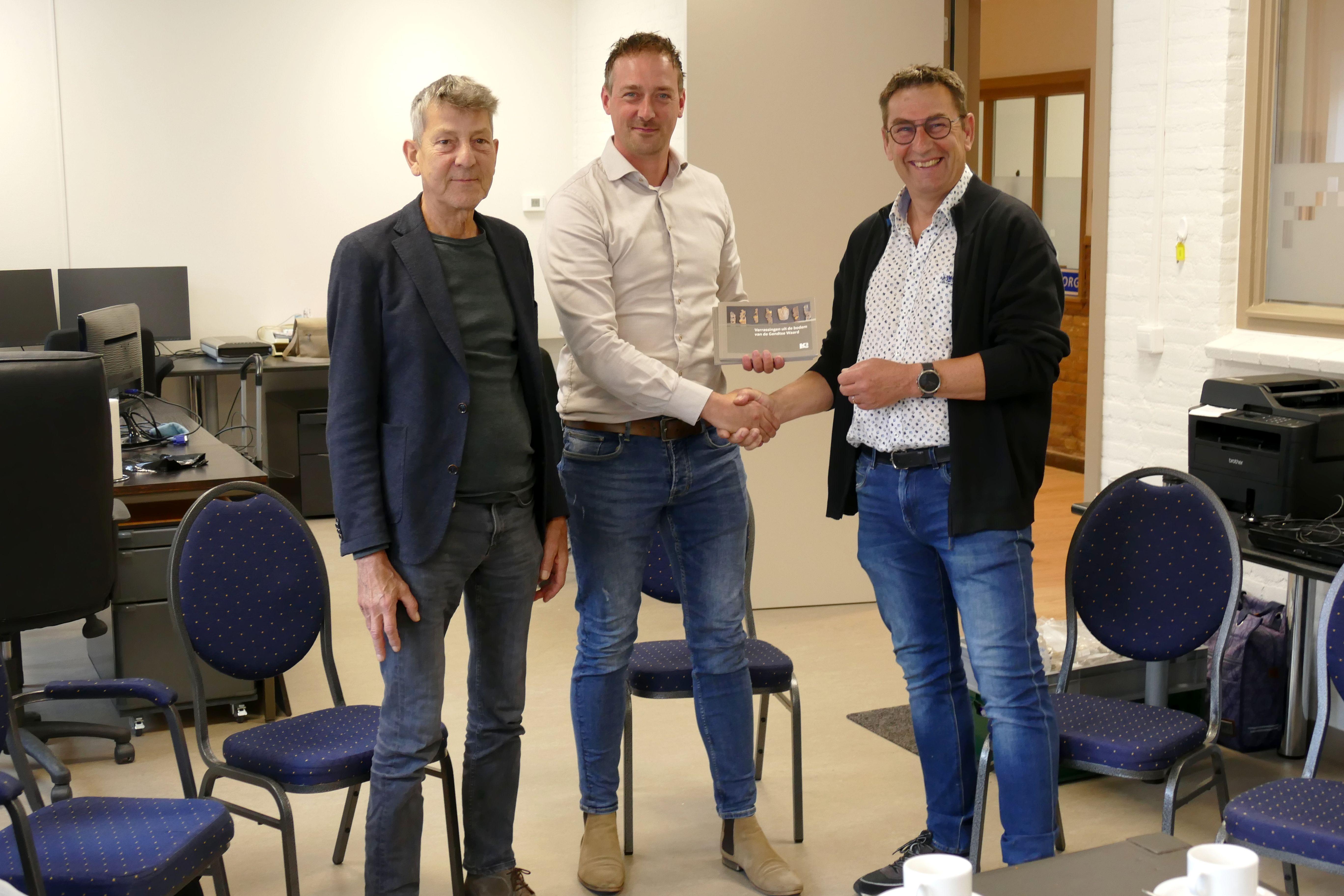 Marten Smits (K3Delta) reikt het boekje met foto's van de gevonden objecten uit aan René Derksen, voorzitter van de historische kring. Links staat Erwin Labijt. Foto: Henk Klaassen