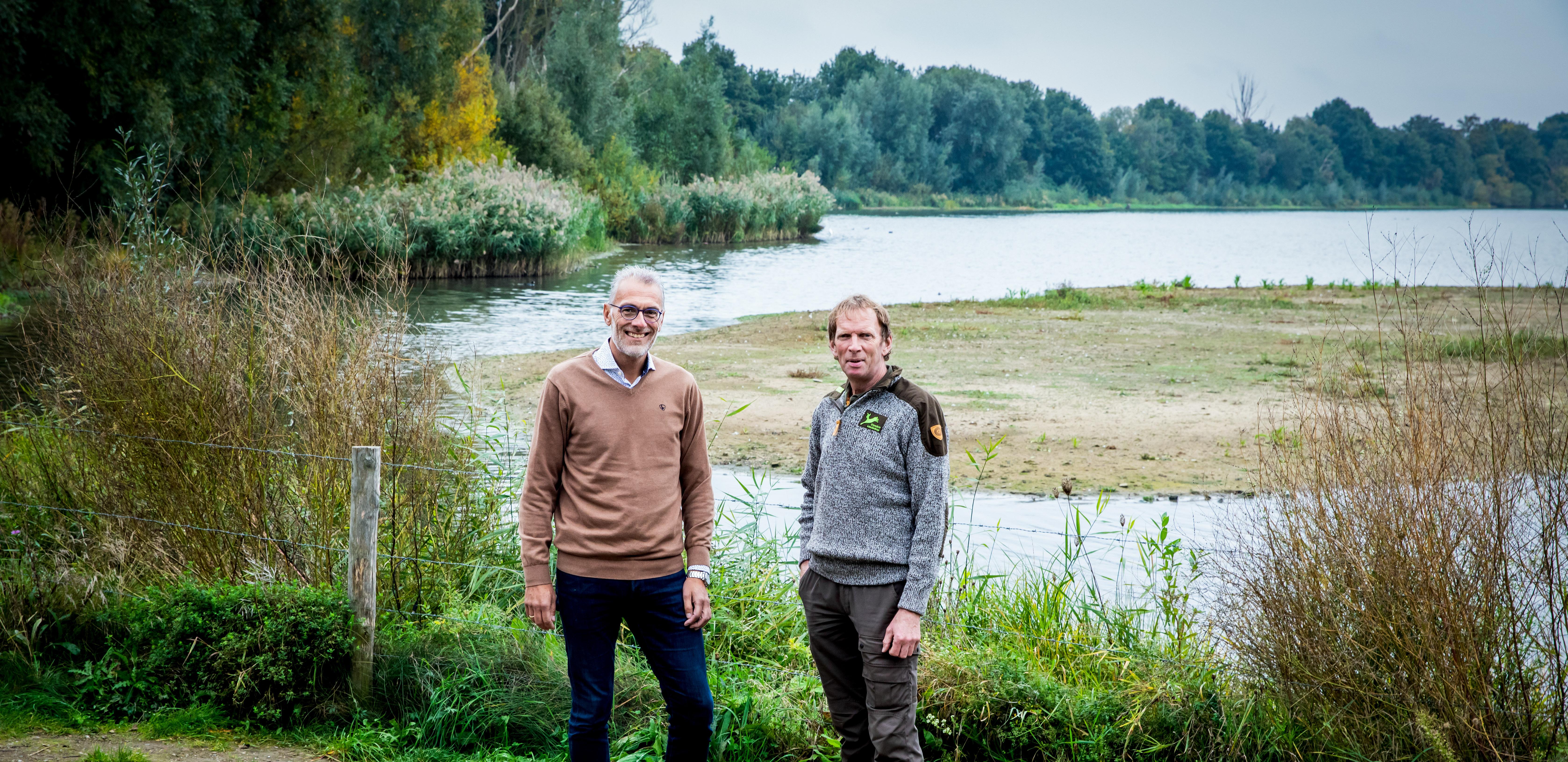 Wim Vermeule (links op de foto), Grondbank GMG: “De Hooge Kampse Plas had steile oevers met een waterdiepte van minimaal 8 meter en nauwelijks vestigingsmogelijkheden voor waterdiertjes. Door het toepassen van grond en baggerspecie is een nieuwe situatie gerealiseerd met een ondiepe zone, eilanden en natuurvriendelijke oevers. Mooi dat het natuuronderzoek en de monitoring bevestigen dat deze vorm van herinrichting werkt.”