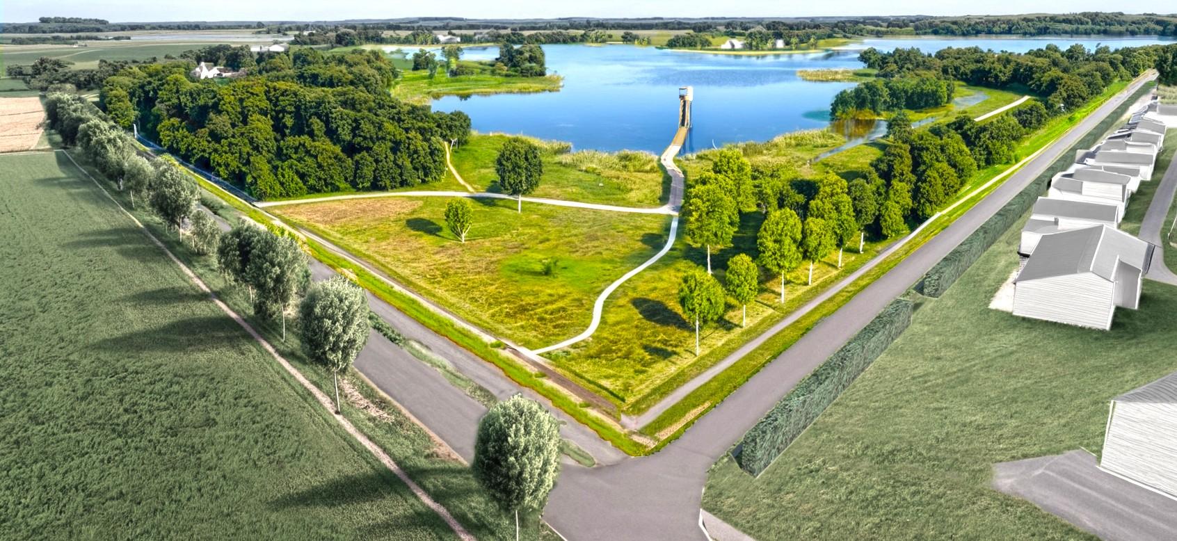 Afbeelding: Impressie vanaf de westzijde van de Overbrugse Plas (kruising Grotebrugse Grintweg / Blauwe Kampseweg) met wandelpaden en uitkijkpunt.